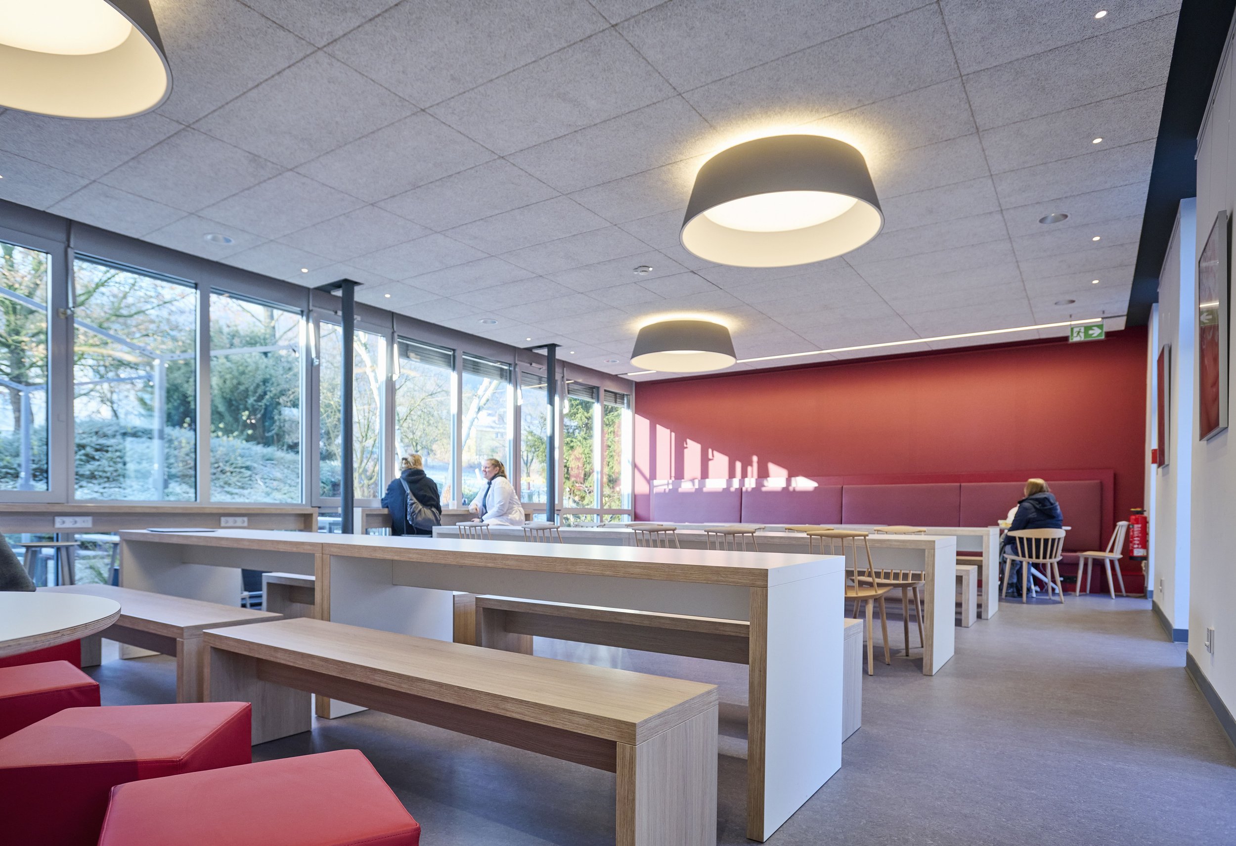 In der Hochschule Bielefeld entstand eine maßgeschneiderte Lösung, die den täglichen Anforderungen einer Hochschulmensa standhält und gleichzeitig ein modernes, einladendes Ambiente bietet. Die von uns gefertigten Tische und Sitzbänke zeichnen sich durch eine reduzierte Formensprache und eine präzise Verarbeitung aus. Die Kombination aus warmen Holzoberflächen und hellen, widerstandsfähigen Beschichtungen sorgt für eine freundliche und zugleich strapazierfähige Einrichtung. Großzügige Tischflächen bieten ausreichend Platz für Studierende und fördern kommunikative Begegnungen. Ein zentraler Bestandteil des Projekts ist die individuell gefertigte Ausgabetheke. Sie verbindet funktionale Abläufe mit einer klaren architektonischen Gestaltung. Hochwertige Materialien und durchdachte Details gewährleisten eine einfache Reinigung sowie eine langlebige Nutzung im stark frequentierten Mensabetrieb. Das markante Rot als gestalterisches Element zieht sich durch den gesamten Innenraum – von Wandflächen bis hin zu maßgefertigten Einbauten wie der Kaffee- und Geschirrstation. Die von uns realisierten Schranklösungen bieten nicht nur ausreichend Stauraum, sondern setzen zugleich einen bewussten gestalterischen Akzent im Raum.